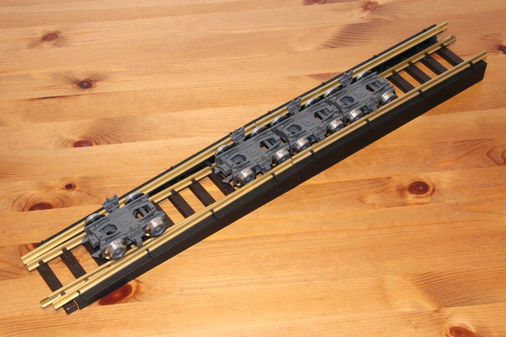 VORBILD Viele Eisenbahnen wurden am Ende des 19. Jahrhunderts gebaut. An Orten, an denen die Normalspur nicht erreicht werden konnte, wurde oft eine schmalspurige Eisenbahn errichtet. Die Güter mussten oft umgeladen werden, von der Normalspur auf die Schmalspur. Um diesen aufwändigen Transport zu vermeiden, wurden normalspurige Waggons häufig auf sogenannte Rollböcke gesetzt. In einer "Rollbockgrube" erfolgte das Aufbocken. In solch einer Grube wurden Rollböcke unter die Normalspurachsen gesetzt. Nachdem die Waggons sicher aufgebockt waren, fuhr man sie aus der Grube heraus und setzte ihre Reise zum Kunden fort. Überall waren Rollbockgruben zu finden. Wie auch im Harz, bei der Nordhausen-Wernigeroder Eisenbahn (NWE) Als die Eisenbahn durch das Harzgebirge führte, wurde die Eisenbahn als Schmalspurbahn bezeichnet. Zwei Rollbockgruben wurden von der NWE errichtet, eine in Wernigerode und eine in Nordhausen. Mittlerweile haben sich die Schmalspurbahnen im Harz privatisiert und werden als Harzer Schmalspurbahnen (HSB) bezeichnet. Der Rollbockgrube in Wernigerode wurde 2004 abgerissen. Die Rollbockgrube von 1897 in Nordhausen ist noch vorhanden, wird aber nicht mehr benutzt. Die HSB hat 1998 eine neue Rollbockgrube in Nordhausen in Betrieb genommen. MODELL Mit dieser Rollbockgrube können Sie das Auf- und Abbocken normalspuriger Güterwagen voll automatisch im Modell erleben. Die Rollbockgrube ist 60 cm lang. Das Gleisprofil und die Gleishöhe (an der Schmalspurseite) sind identisch mit denen von z.B. Train Line 45 und LGB®. Die Rollbockgrube kann dadurch ohne weitere Anpassungen verlegt werden. Die Grube bietet Platz für vier Rollböcke (wie zum Beispiel die Art.Nr. 0005-0101). Die Rollbockgrube ist mit allem Nötigen versehen, um das Auf- und Abbocken der Normalspurwagen (wie z.B. die Art.Nr. 0006-0001) automatisch ablaufen zu lassen. Man kann die Rollbockgrube um jeweils 30 cm erweitern mittels Art. Nr. 0005-0002. |