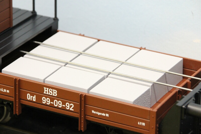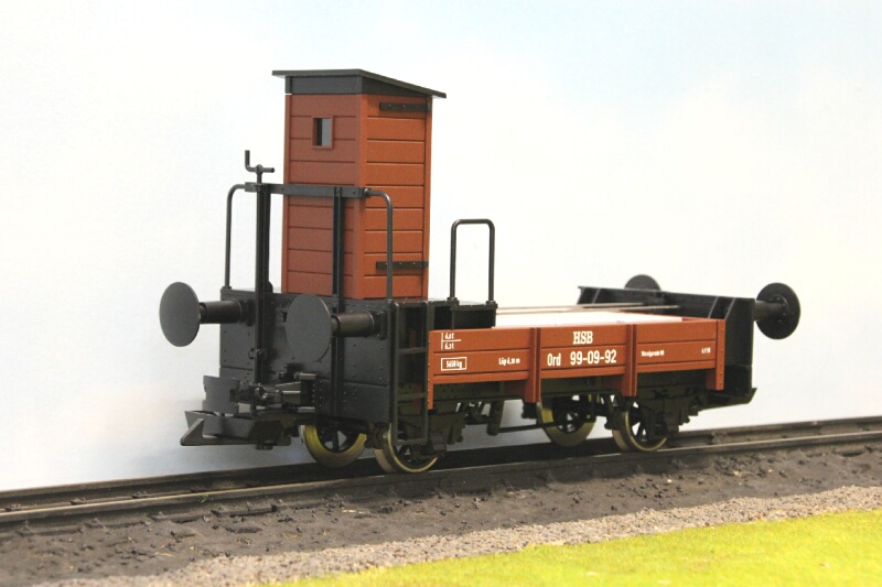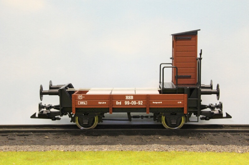 VOORBEELD Aan het einde van de 19e eeuw werd in de Duitse Harz een spoorlijn aangelegd: de Nordhausen Wernigeroder Eisenbahn (NWE). Omdat de lijn door bergachtig gebied liep, werd deze als smalspoorlijn aangelegd. Om het overladen van goederen te voorkomen, werden normaalspoorgoederenwagons met behulp van Rollbocken over de smalspoorlijn vervoerd. De Rollbocken werden aanvankelijk met koppelstangen gekoppeld, wat een zware belasting voor de medewerkers was. Daarom werden tussen 1922 en 1926 zes zogenaamde Open Rangeerdienst Wagons (Ord) aangeschaft. Deze kregen de nummers NWE 1001-1003 en 1011-1013. De wagons waren aan beide zijden voorzien van een koppelingsmogelijkheid met zowel smalspoor- als normaalspoormaterieel. Een Rollbocktreineenheid werd dan altijd tussen twee Ord-wagens ingesloten, zodat men altijd kon rijden, rangeren en omlopen. In 1949 werden de wagons eigendom van de Deutsche Reichsbahn (DR) en kregen ze de nummers 99-01-89 t/m 99-01-94. In 1993 kwamen de wagons in handen van de Harzer Schmalspoorbahnen (HSB), die de wagons omnummerde in 99-09-89, 99-09-91 t/m 99-09-93. De andere twee waren reeds door de DR gesloopt. Van de zes wagons zijn er dus nog vier bewaard gebleven: drie bij de HSB en één bij de DEV in Bruchhausen-Vilsen. - 99-09-89: DEV in revisie. - 99-09-91: HSB Museumswagen. - 99-09-92: HSB Museumswagen. - 99-09-93: HSB niet bedrijfsvaardig. In 2012 heeft de HSB twee wagons gereviseerd, waarbij ze hun oude nummers 99-01-91 en 99-01-92 weer terugkregen. MODEL Veel aandacht is besteed aan de nauwkeurige omzetting in schaal 1:22,5. Het model is vervaardigd uit hoogwaardig kunststof, dat door en door gekleurd is. Het is voorzien van edelstalen wielbanden, en kogelgelagerde assen zorgen voor de beste rijeigenschappen. De buffers voor het normaalspoor zijn geveerd. Het model is, net als zijn voorbeeld, ontwikkeld als koppelwagen tussen normaalspoormaterieel (op Rollbocken) en smalspoormaterieel. Daarvoor beschikt het model over de door ons veel toegepaste trechterkoppelingen. Als lading liggen in de wagon imitatie betonblokken. Wij bevelen aan deze wagons in samenhang met onze normaalspoorwagons te gebruiken op bogen met een radius vanaf 120 cm. |