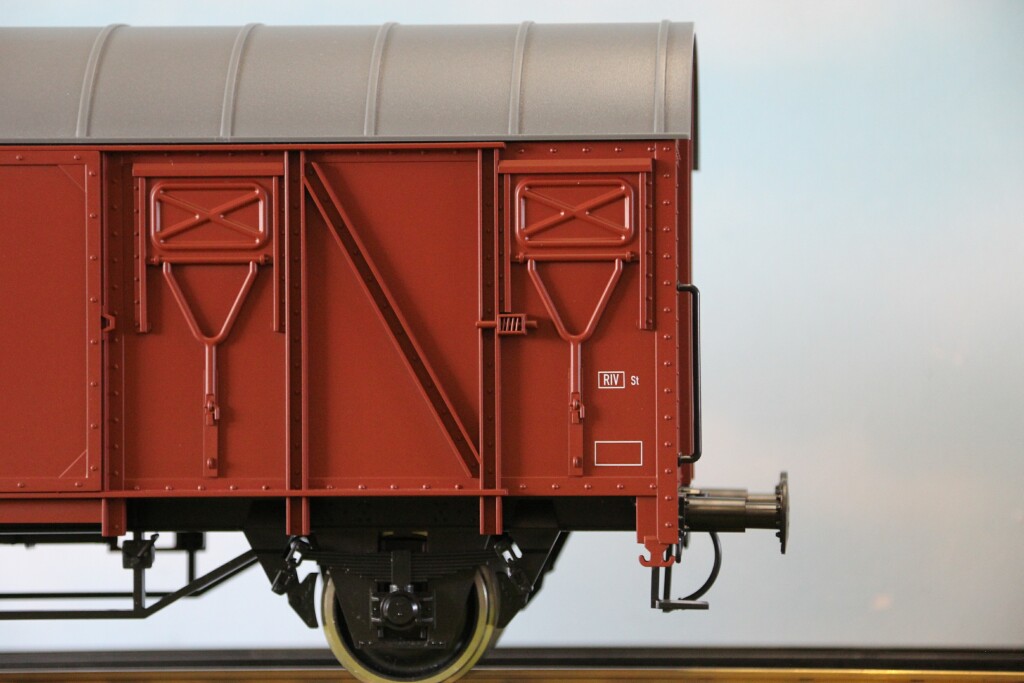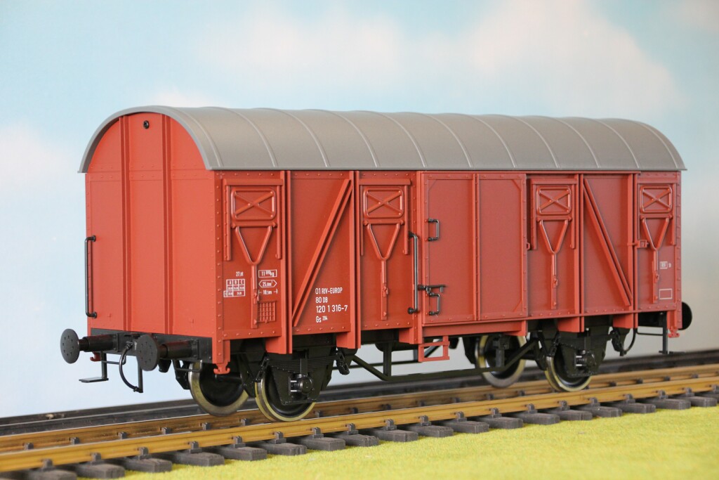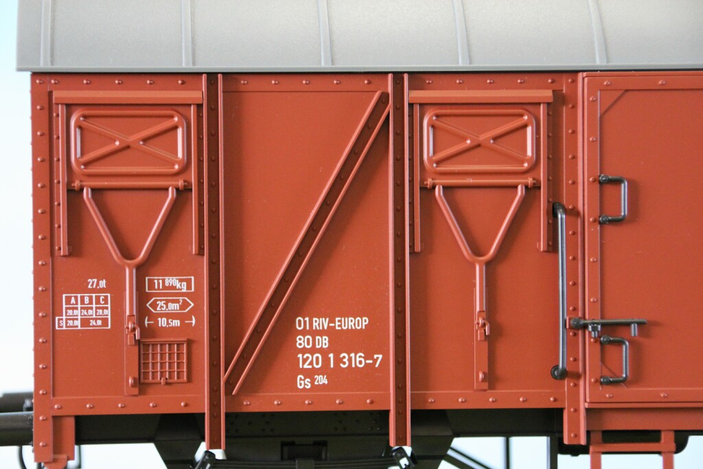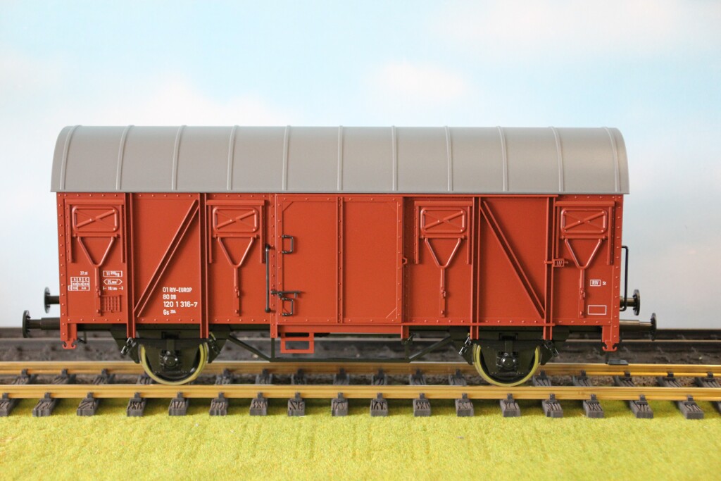VORBILD Um Stückgut effektiv und sicher befördern zu können, wurden gedeckte Güterwagen in großen Stückzahlen gefertigt. Man versuchte, nach und nach verschiedene Aspekte zu standardisieren. So entstand unter anderem ein gedeckter Güterwagen nach UIC-Norm: der Gs (auch Gmms oder Gms54). Dieser Wagentyp war bei fast allen Eisenbahnen in Europa im Einsatz, so auch bei der ÖBB. Wie viele Waggons insgesamt gebaut wurden, ist unbekannt, aber es waren sehr viele. Von Serie zu Serie waren manchmal Unterschiede erkennbar. Auch nach einer Revision konnte sich das äußere Erscheinungsbild eines Waggons verändern. MODELL Mit diesem Modell präsentieren wir die DB Epoche IV-Variante des Typs Gs204. Großer Wert wurde auf die detailgetreue Umsetzung im Modell gelegt. Das Modell ist aus hochwertigem Kunststoff gefertigt und entspricht den gültigen Spur-II-Normen. Es ist mit edelstahlbereiften Rädern ausgestattet, und kugelgelagerte Achsen sorgen für beste Fahreigenschaften. Sowohl die Puffer als auch die Achsen sind gefedert. Das Modell wurde als Ladegut für die Rollböcke (u.a. Art. Nr. 0005-0101 und 0005-0201) entwickelt, sodass Sie den Rollbockverkehr im Modell vollständig nachstellen können. Die passende Rollbockgrube erhalten Sie unter der Art Nr. 0005-0001. Häufig gestellte Frage: "Wie hoch ist das Modell?" - Aufgestellt auf 64-mm-Gleisen beträgt der Abstand zwischen Schienenoberkante und Dachoberseite 18,5 cm. - Aufgebockt auf unsere Rollböcke beträgt der Abstand zwischen Schienenoberkante und Dachoberseite 20,0 cm. Wir empfehlen, dieses Modell auf Gleisbögen mit einem Mindestradius von 120 cm zu verwenden. LICHTRAUM Möchten Sie wissen, ob der gedeckte Güterwagen durch Ihren Tunnel passt? Lichtraum zum Ausdrucken: