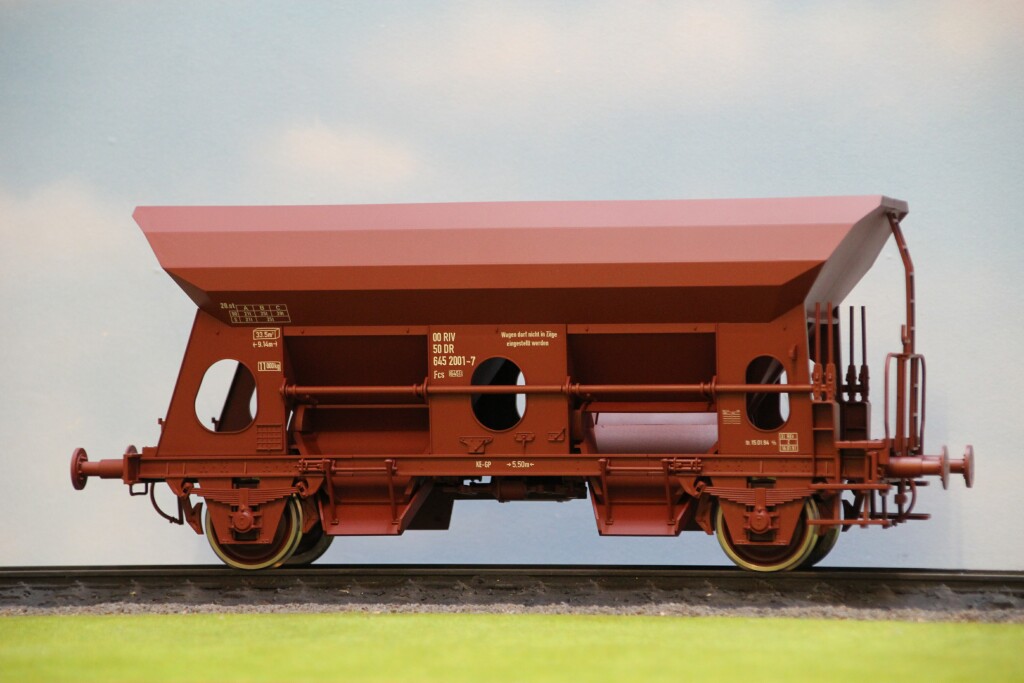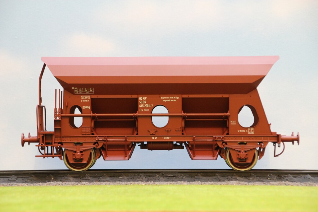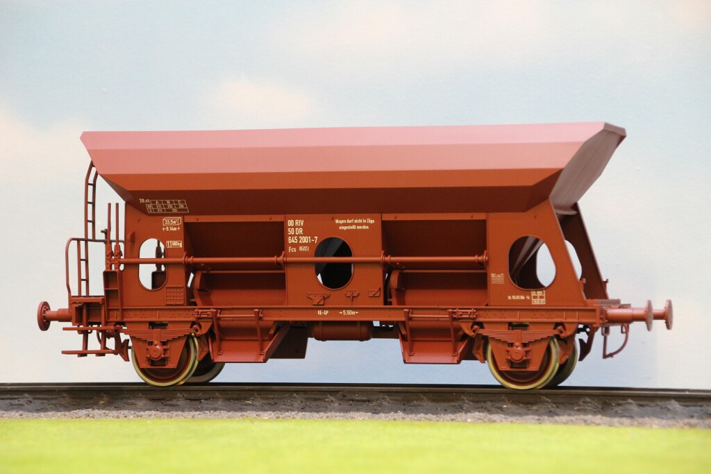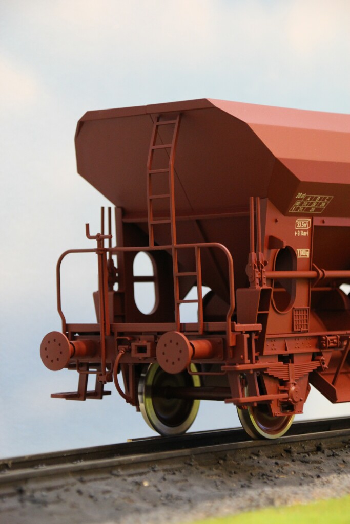 VORBILD Um Schüttgut effektiv und sicher befördern zu können, wurden in großen Stückzahlen Schotterwagen angefertigt. Man versuchte nach und nach, das eine und andere zu standardisieren. So entstand u.a. der "Fcs 6451". Dieser Typ wurde Mitte der 50er Jahre in großen Stückzahlen von der Deutschen Industrie-Werke AG in Berlin-Spandau gebaut. Von diesem Typ sind heute noch vier Exemplare bei den Harzer Schmalspurbahnen verfügbar. Sie dienen (aufgeschemelte auf Rollwagen) als Schotterbehälter und kommen bei Gleisbauarbeiten zum Einsatz. Die Verladung erfolgt dann im Werk Unterberg bei Eisfelder Talmühle. In ähnlicher Form sind im Laufe der Jahre tausende Fcs-Schotterwagen in ganz Europa in Dienst gestellt worden. Sie waren dann auch bei fast allen Eisenbahnen in Europa unterwegs. Auch in der heutigen Zeit gibt es noch viele Fcs-Schotterwagen. Auch bei den Schmalspurbahnen waren und sind die Fcs-Wagen anzutreffen. Auch bei den Harzer Schmalspurbahnen waren die Fcs-Schotterwagen oft zu Gast, sowohl auf Rollwagen als auch auf die modernen Vevey-Rollböcke. MODELL Viel Wert wurde auf die genaue Umsetzung im Modell gelegt. Wir haben den Waggon wieder genau in 1:22,5 umgesetzt. Das Modell wird aus hochwertigem Kunststoff hergestellt. Der Wagen entspricht den gültigen Spur II-Normen. Das Modell ist mit Edelstahl-Radreifen ausgestattet. Kugellagerachsen sorgen für das beste Fahrverhalten. Die Puffer sind gefedert, ebenso die Achsen. Das Modell lässt sich mit vorbildgerechten Schraubenkupplungen nachrüsten (Art. Nr. 0006-0102). Das Modell ist als Ladegut für die Rollböcke (u.a. Art. Nr. 0005-0201 und 0005-0301) entwickelt worden. Somit können Sie den Rollbockverkehr im Modell vollständig wieder erleben. Die passende Rollbockgrube erhalten Sie unter der Art Nr. 0005-0001. Eine häufig gestellte Frage: "Wie hoch ist das Modell?" - Normal aufgestellt auf 64 mm Gleis, beträgt der Abstand zwischen Schienenoberkante und Oberseite 17,0 cm. - Aufgebockt auf unsere Rollböcke, beträgt der Abstand zwischen Schienenoberkante und Oberseite 18,3 cm. Wir empfehlen, dieses Modell auf Gleisbögen mit einem Mindestradius von 120 cm zu verwenden. LICHTRAUM Möchten Sie wissen, ob der Schotterwagen durch Ihren Tunnel geht? Lichtraum zum Ausdrucken:
